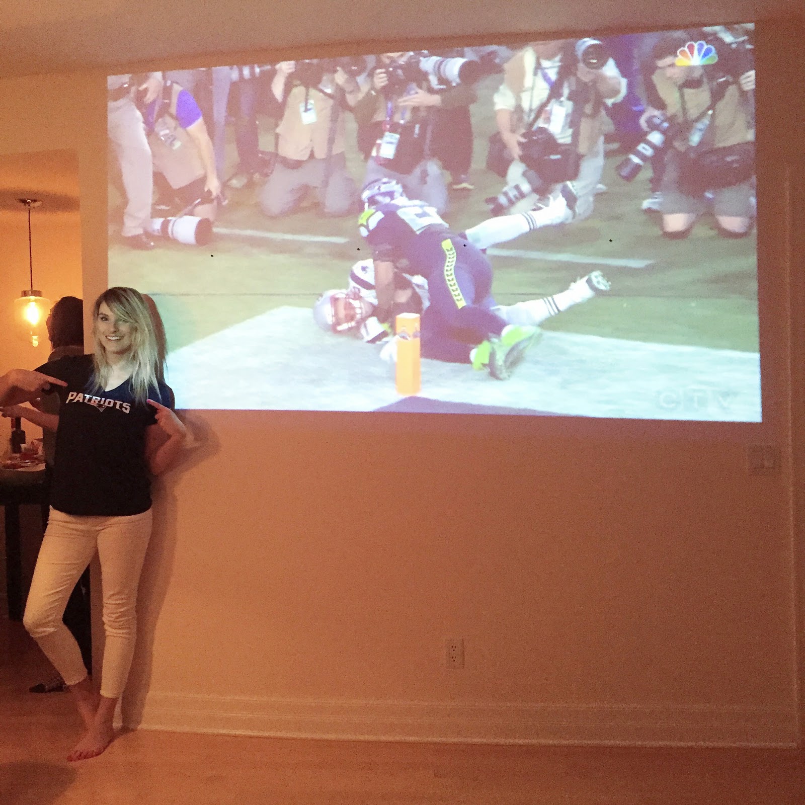 Later that evening, we hosted a Superbowl party at our place. Our friend brought his projector and we had planned to get a screen but couldn't find one and thought the whole plan was ruined until said friend ended up improvising and using this wall in our condo (we removed the art) and it worked perfectly! It was such a hit and perfect for the 15+ people we had over.