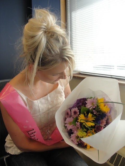 My coworkers totally tricked me. They threw me a bridal shower and I had no idea! Very thoughtful and very impressive. Here's how it went down: My girl friend CG and I work together-ish. She scheduled a meeting for us for a 'quick chat' but assured me everything was okay. 15 minutes before our meeting, I ran to the bathroom, thinking I would have enough time, but ran into my friend. Now this is odd since she works on the first floor and I'm on the sixth, but I made nothing of it and she said she'd wait for me. Sure enough, when I came back, she was waiting outside a boardroom (with a closed door) and pulled me in where over 20 people were waiting to surprise me! Isn't that the sweetest? They had a huge cake, a beautiful bouquet of flowers for me, CG made cherry chip cupcakes because she knows they're my fave, they also had some drinks, a 'BRIDE' sash and a super sweet card with a gift card inside! I am blown away and they really got me good - I feel so thankful.